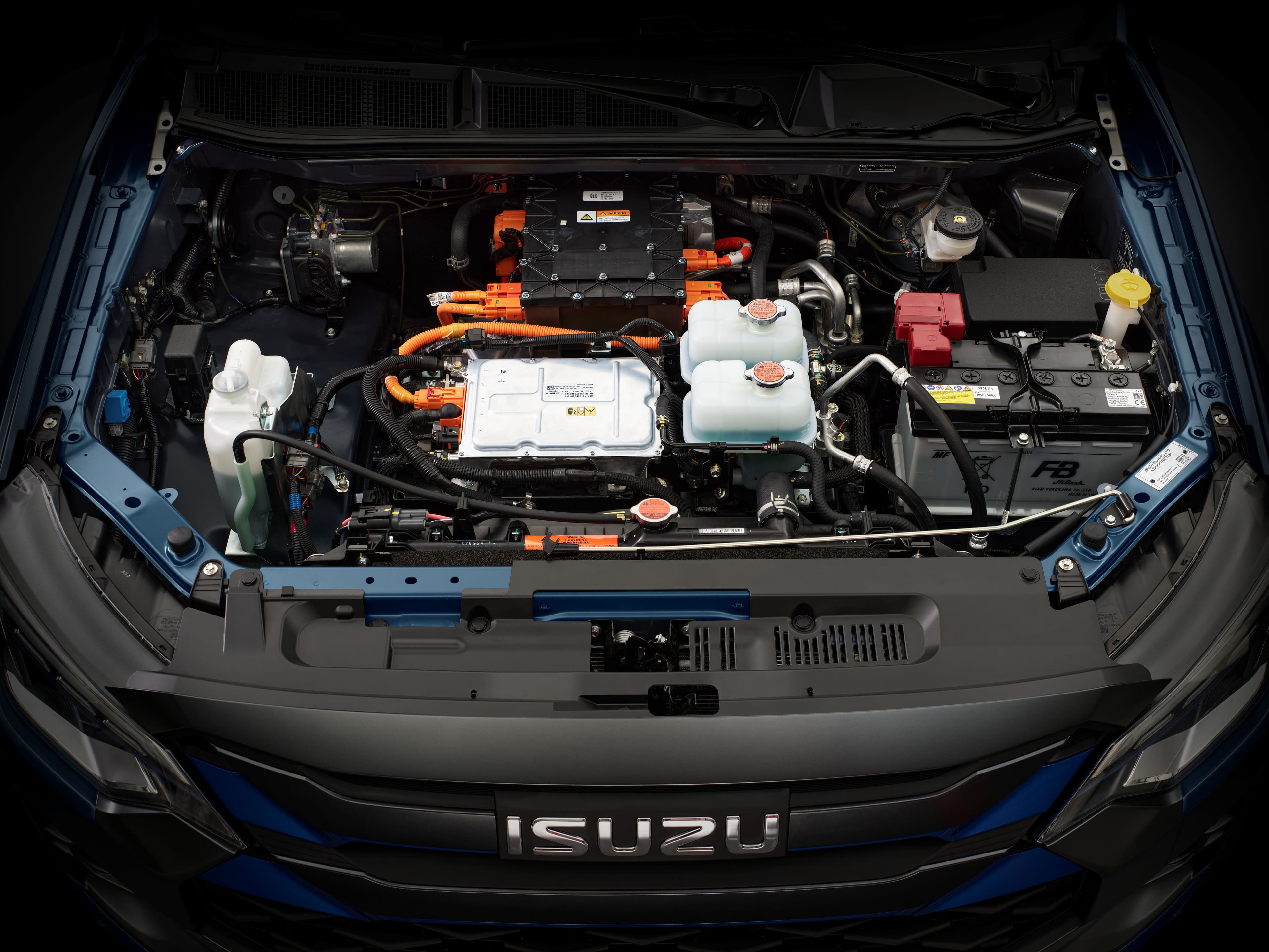 Le D-MAX EV est construit sur le châssis solide et fiable du D-MAX. Ce pick-up est équipé d'une motorisation électrique à double moteur, composée d'un moteur de 43 kW (58 ch) à l'avant et d'un puissant moteur de 97 kW (102 ch) à l'arrière. Le D-MAX EV offre ainsi une puissance impressionnante sans compromis, exactement comme on peut l'attendre d'un pick-up japonais pur sang.